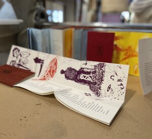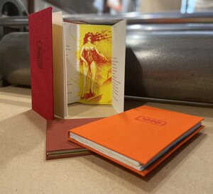 “Lorelei” si svolge su un unico foglio di carta lungo e orizzontale che piegato a fisarmonica si srotola per lasciare scoprire la storia e si arrotola su se stessa una volta la lettura finita. Qui le immagini sono realizzate con la serigrafia. Da un disegno di Nadine si sono create due telai di serigrafia con ciascuno un colore così da creare un’immagine più dettagliata e più suggestiva. Toni dal giallo al rosso che lasciano passare brevi momenti di bianco che non sono altro che il fondo bianca della carta che spica in mezzo all’intensità del colore.