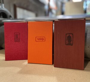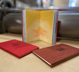Il bello di quest’opera libresca è anche la convivenza di varie maestrie e di vari spiriti creativi che hanno portato alla materializzazione di questi tre volumetti tenuti insieme da una stringa di cuoi e una grande perla per fermare l’avvolgimento del cordoncino attorno ai volumi.