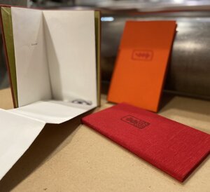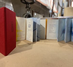 Pierre invece si occupava come al solito della composizione dei testi e a me è stato chiesto di realizzare le rilegature dei tre volumetti. Mi vedo ancora seduta al tavolo centrale del Tintoretto. Vedevo arrivare le persone e i curiosi che entrano al Tintoretto e le mie mani continuavano a incollare, piegare, mettere sotto peso le copertine cartonate dei vari volumi. Si, perché i volumi erano 30 per ogni poesia e questo fa 90 esemplari in tutto e li ci voleva non solo le miei ditta rapide ma anche e soprattutto la mia pazienza. Ogni poesia era contenuta in una rilegatura in tessuto di colore diverso: arancio per “Blueprint”, rosso scarlatto per “Lorelei” e amaranto per “In or out?”.