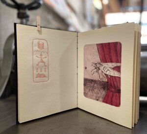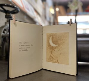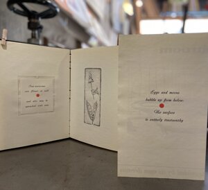 Questo libro è un bel esempio di collaborazione tra i committenti del lavoro - in questo caso l’artista e lo scrittore - e la squadra di stampatore/rilegatore che mettono a frutto il loro sapere e la loro esperienza per dare vita a un libro.